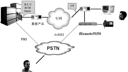 在iRemote遠(yuǎn)端坐席實(shí)現(xiàn)方式中,系統(tǒng)采用的遠(yuǎn)端語音模塊iRemote9150由安裝在M1內(nèi)的MIG RLC卡板和遠(yuǎn)端單元iRemote9150組成。MIG RLC卡板通過10BASE-T以太網(wǎng)接口與路由器相連。iRemote單元既可通過10BASE-T以太網(wǎng)接口與路由器相連,也可以以ISDN BRI方式與PSTN相連,每個(gè)遠(yuǎn)端單元最多提供4個(gè)BRI接口,32個(gè)數(shù)字話機(jī)接口,一個(gè)用于傳真的模擬端口。每塊MIG RLC卡板有一DSP模塊,可同時(shí)處理8路語音,通過在MIGLC板上增加3塊DSP模塊,最多可同時(shí)處理32路話音。IP網(wǎng)上的話音符合UDP/IP協(xié)議,話機(jī)狀態(tài)控制信號符合TCP/IP協(xié)議。同一遠(yuǎn)端單元間的兩用戶通話無需占用M1帶寬。