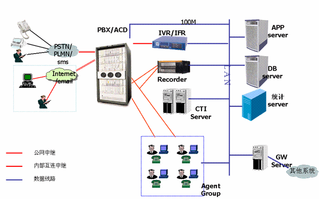 在建立呼叫中心前,廣州自來水公司只有覆蓋公司和各供水管理所的供水熱線系統(tǒng),該系統(tǒng)只有簡單的接入電話,沒有完善的呼叫中心功能,話務量承受能力小,接通率低,沒有統(tǒng)一的服務窗口和后臺,統(tǒng)計功能也只能靠手工實現(xiàn)。為了更好的為廣大市民服務,廣州市自來水公司決定取消原先供水熱線工作模式,由公司成立客戶服務中心集中管理,建立基于互聯(lián)網(wǎng)的呼叫中心,負責全市范圍內(nèi)客戶服務,使客戶能夠通過各種資訊工具如電話、傳真、電子郵件、短信等方式從自來水公司獲取用水信息,并能實現(xiàn)業(yè)務申請、投訴、業(yè)務受理、業(yè)務咨詢、業(yè)務查詢等,采用回撥技術實現(xiàn)客戶回復、客戶回訪、客戶調(diào)查等業(yè)務。
