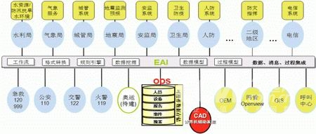 建立在ODS基礎上的ODS+EAI框架為整個公共安全應急指揮系統(tǒng)提供基礎架構,通過該框架不僅可以交換并緩存數(shù)據(jù)信息,同時可以交換和記錄調度命令,通過數(shù)據(jù)采集構建信息數(shù)據(jù)基礎,記錄并歸檔事件處理過程,維護和利用預案處理過程。同時該框架也為我們建議的本地或遠程OEM系統(tǒng)、甚至是移動的OEM系統(tǒng)提供有力的技術和數(shù)據(jù)支撐。