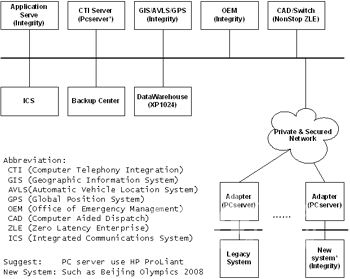 結合HP公司在全球范圍內911應急系統(tǒng)和安全領域的建設經驗和案例,HP公司針對國內對公共安全建設的需求,提供了公共安全系統(tǒng)的建設架構和解決方案 --- HP公共安全ODS+EAI核心解決方案。如下圖示