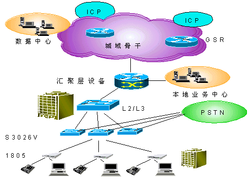 在用戶(hù)接入層Quidway S3026V提供24路VDSL接入,在普通雙絞線上提供12Mbps的雙向?qū)ΨQ(chēng)數(shù)據(jù)業(yè)務(wù),傳輸距離最大可達(dá)1500m,在完成以太網(wǎng)接入的同時(shí),不影響POTS業(yè)務(wù)。S3026V上行FE接口直接接入L3交換機(jī)。同時(shí),通過(guò)雙絞用戶(hù)線完成了與PSTN交換機(jī)的相連,將寬帶、窄帶業(yè)務(wù)在S3026V上匯合,并通過(guò)已有雙絞電話線連接至遠(yuǎn)端用戶(hù)設(shè)備(1805)。1805可以通過(guò)五類(lèi)線與計(jì)算機(jī)網(wǎng)卡相連。