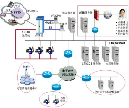 針對政府目前熱線電話眾多,管理不規(guī)范,資源無法共享的問題,華為公司提出的基于資源整合理念的解決方案,采用華為公司呼叫中心技術(shù)構(gòu)建完整的計算機電信集成(CTI)系統(tǒng)體系,并充分利用政府現(xiàn)有的信息網(wǎng)絡(luò)資源,一方面整合原有分散的熱線,啟用12345政府熱線號碼統(tǒng)一接入;另一方面將自動語音查詢、人工服務(wù)、信息資料處理緊密結(jié)合起來,依托地方政府各類業(yè)務(wù)技術(shù)支持系統(tǒng)和網(wǎng)絡(luò)系統(tǒng),建立一套通暢的來電業(yè)務(wù)公文流轉(zhuǎn)系統(tǒng),通過人工受理或自動語音服務(wù)等方式,為人民群眾提供全天候24小時不間斷的服務(wù)。最終整合現(xiàn)有的全部政府部門政府熱線資源,使政府政府熱線服務(wù)范圍覆蓋到政府公共服務(wù)的全部領(lǐng)域,為市民提供全方位、全天候、高效率的政府政府熱線服務(wù),市民只記一個電話號碼,只打一次電話,就能得到政府答復(fù)和服務(wù)。