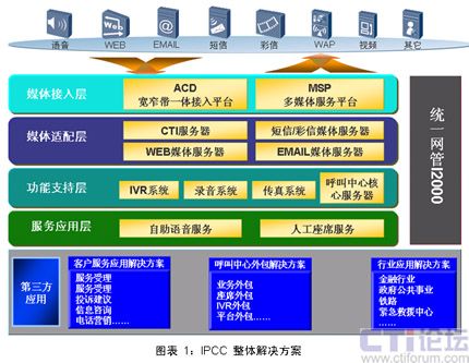 IPCC(IP聯絡中心IP Contact center)是針對金融、政府、IT和電子商務、物流、制造、緊急救援等行業(yè)的特點,推出的一體化多媒體聯絡中心解決方案。結合電話、FAX、E-mail、Web、視頻、短信等多種通訊手段,建立客服、銷售及市場推廣的高效溝通渠道。