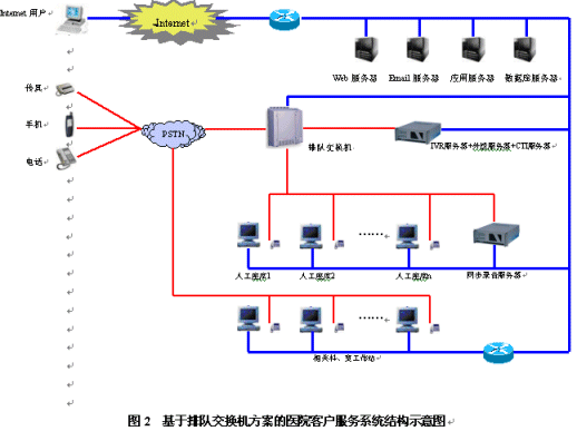 醫(yī)院客戶服務(wù)系統(tǒng)是一個(gè)集合電話語音、計(jì)算機(jī)網(wǎng)絡(luò)、數(shù)據(jù)庫等技術(shù)的綜合信息服務(wù)平臺,主要由自動語音應(yīng)答系統(tǒng)、人工座席和數(shù)據(jù)庫系統(tǒng)三部分組成。