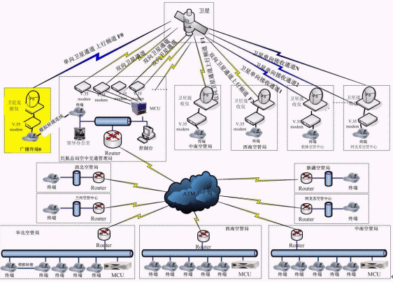 如上圖所示,本系統(tǒng)是一個(gè)由H.323和H.320組成的混合組網(wǎng)的視頻會(huì)議系統(tǒng),總局空管局和華北、華東、東北空管局是通過(guò)地面ATM網(wǎng)絡(luò)傳輸,采用的是H.323協(xié)議組網(wǎng),而中南、西南、西北和新疆空管局及其下屬各個(gè)空管中心(站)采用兩種連接方式,一種是一期建設(shè)的ATM網(wǎng)絡(luò),另一種是衛(wèi)星網(wǎng)絡(luò),衛(wèi)星網(wǎng)絡(luò)采用的是H.320協(xié)議組網(wǎng)。其中,在H.320協(xié)議組網(wǎng)的系統(tǒng)中,終端又可分為雙向通訊終端和單向通訊終端,為了節(jié)約衛(wèi)星通道的租用費(fèi)用,其中4條線(xiàn)路采用雙向通訊方式,剩下線(xiàn)路采用單向接收的方式。