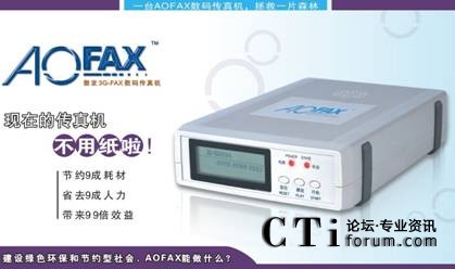 CTI論壇(ctiforum)10月20日消息(記者 潘婷婷):傳真機自1906年發(fā)明以來,到今天已走過一百多年的歷史,傳真的形式也從最早的機械傳真機、光電傳真機、數(shù)字傳真機發(fā)展到今天的電子傳真、電腦傳真、網(wǎng)絡傳真、無紙傳真、傳真軟件、傳真系統(tǒng)、傳真服務器等。其中,由金恒科技(深圳)有限公司推出的傲發(fā)3G-FAX電子傳真系列產品(AOFAX),是新一代傳真的典范,引領著未來傳真發(fā)展的方向。