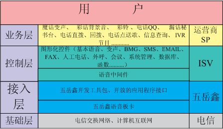依靠五岳鑫公司強(qiáng)大的技術(shù)優(yōu)勢和對增值業(yè)務(wù)的深刻理解,以我公司自主研發(fā)的具有國際先進(jìn)水平的語音板卡為基礎(chǔ),為廣大增值業(yè)務(wù)服務(wù)商提供的語音增值業(yè)務(wù)綜合平臺(tái),將種類繁多的語音增值業(yè)務(wù)融合在一個(gè)系統(tǒng)平臺(tái)中。不僅支持行業(yè)內(nèi)大多數(shù)的語音增值業(yè)務(wù),還能方便、快速地面向市場提供各種的語音增值業(yè)務(wù)。
