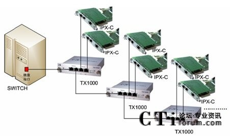 IP話機的錄音示意圖和圖1-4 E1/T1數(shù)字線錄音示意圖類似。不過此時PBX與IP話機之間的連線改成網(wǎng)線(RJ45)了。并且在兩個設(shè)備之間多了個并接設(shè)備TX100,其示意圖如下: