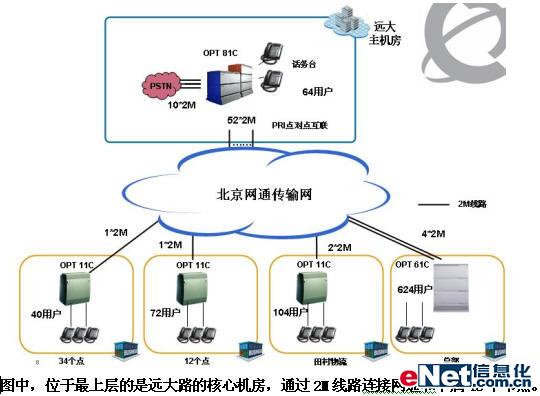 新的網(wǎng)絡(luò)建成以遠(yuǎn)大路中心機(jī)房為核心的星形網(wǎng)絡(luò),租用北京網(wǎng)通2M專線的方式同各個(gè)門市店連接。各個(gè)門市店設(shè)立了自己的程控交換機(jī),并通過(guò)E1中繼方式和核心機(jī)房實(shí)現(xiàn)全網(wǎng)互聯(lián)。在此方案中,所有的市話呼入和呼出都通過(guò)核心節(jié)點(diǎn)同網(wǎng)通之間的中繼通道,從而實(shí)現(xiàn)大中電器內(nèi)部話音通訊的統(tǒng)一編號(hào)方案、統(tǒng)一撥號(hào)規(guī)則、統(tǒng)一維護(hù)和管理;并對(duì)外公布公開(kāi)和便于記憶的號(hào)碼,以配合網(wǎng)點(diǎn)的促銷活動(dòng),以及未來(lái)客戶服務(wù)等應(yīng)用的擴(kuò)展。
