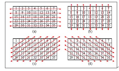 以對(duì)數(shù)據(jù)的位置重新排列方法,如圖1.1所示,假設(shè)其中的一個(gè)子圖皆為一張檔案大小5*7的圖文件,則在”位置重新排列”的方法中,其先對(duì)檔案數(shù)據(jù)作左右方向位置的調(diào)換,如圖1.1(a);再將經(jīng)過左右方向轉(zhuǎn)換的檔案數(shù)據(jù),作上下方向位置的調(diào)換,如圖1.1(b);再將經(jīng)過左右方向與上下方向轉(zhuǎn)換的檔案數(shù)據(jù),作右上左下方向位置的調(diào)換,如圖1.1(c);最后在將經(jīng)過前三個(gè)方向轉(zhuǎn)換的檔案數(shù)據(jù),作左上右下方向位置的調(diào)換,如圖1.1(d)。因此,其對(duì)于每一張圖檔都在四種方位上對(duì)數(shù)據(jù)作位置上的對(duì)調(diào),如此才完成一張圖檔的加密過程。并且在任何一個(gè)方向上,對(duì)數(shù)據(jù)作轉(zhuǎn)換的方向與點(diǎn)數(shù)都是不固定的,其完全依照隨機(jī)的方式,并有產(chǎn)生隨機(jī)方向與點(diǎn)數(shù)的機(jī)制。此種方法,僅針對(duì)檔案中的數(shù)據(jù)調(diào)換位置,即將數(shù)據(jù)位置作重新排列,此舉并不會(huì)改變到檔案中每一個(gè)數(shù)據(jù)內(nèi)容的值。