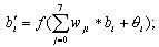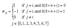 其中,函數(shù)f(x)代表,當(dāng)x≧0時(shí),f(x)等于1;否則f(x)等于0。又其中的wji及θi均為bi的參考值,而其每一個(gè)bi的參考值其計(jì)算方法如下列式(1.3)及式(1.4)所示。