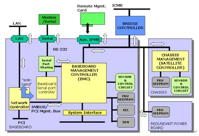 Controller (BMC)。它通過(guò)各別的界面來(lái)管理整個(gè)系統(tǒng),如系統(tǒng)狀態(tài)偵測(cè)及事件過(guò)濾、電源管理、記錄事件發(fā)生時(shí)間及系統(tǒng)回復(fù)控制,并且透過(guò)網(wǎng)絡(luò)或串行端口來(lái)告知管理人員,另外,它提供了IPMB的總線來(lái)和外部的管理控制器互相溝通。