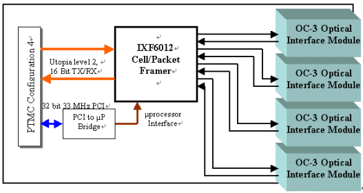 在這個(gè)例子中,Utopia總線是封包傳輸?shù)闹饕獢?shù)據(jù)傳輸路徑,PCI總線是用來(lái)設(shè)定與控制IXF6012,透過使用了PTMC,設(shè)計(jì)工程師可提供各種連接到網(wǎng)絡(luò)處理器的實(shí)體層更多彈性。