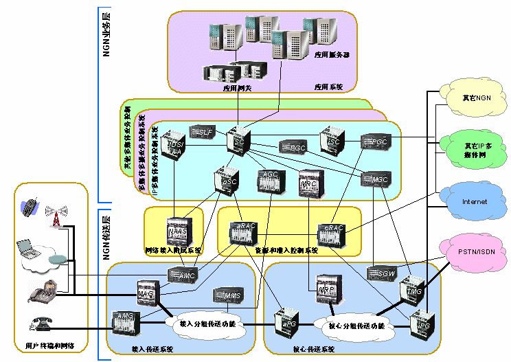NGN是基于分組技術和多層網絡結構的未來電信網絡。它可支持所有可能的業(yè)務,包括使用各種媒體類型和轉播方式的、具有不同性能要求的業(yè)務。它的業(yè)務與傳送分離、控制與用戶數據處理分離的構架允許網絡中各個部件可分別配備和獨立發(fā)展。業(yè)務的提供采用具有開放接口的業(yè)務平臺,可以為第三方業(yè)務提供者所使用。傳送層采用可支持不同帶寬和端到端QoS能力的技術。NGN控制功能可分布于現有和新的網絡基礎設施上并可按組網的要求采用不同的組合形式。網關提供NGN不同域之間或NGN和現有網絡之間的互通。NGN支持通用移動性,使用戶或其他移動體無論其位置或技術環(huán)境的變化都能進行通信和接入業(yè)務。它允許用戶可以跨越不同的有線或無線接入技術,跨越現有網絡的界限使用他們的業(yè)務。| AGC Access Gateway Controller AMC Access Management Controller AMG Access Media Gateway AS Application Server BGC Breakout Gateway Controller MAG Multimedia Access Gateway MGC Media Gateway Control Function MGW Media Gateway MMS Mobility Management Subsystem MRC Multimedia Resource Controller MRP Multimedia Resource Processor NAAS Network Access Attachment Subsystem |