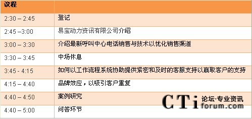 易寶動力資訊有限公司誠摯邀請您出席2010年1月22日舉行的研討會,在此將展示易寶的偉思聯(lián)絡(luò)中心CRM解決方案結(jié)合全面化工作流程和服務(wù)臺功能,如何有助您擴大銷售渠道,贏取客戶支持,微調(diào)市場預(yù)測及提升品牌以吸引忠誠客戶的支持。