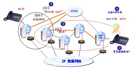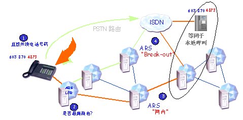 如果,一個(gè)網(wǎng)絡(luò)用戶想與一個(gè)外線用戶通話。ARS應(yīng)用程序分析所撥號(hào)碼。根據(jù)不同的呼叫方向,選擇最廉費(fèi)用的運(yùn)營商,而不管網(wǎng)絡(luò)內(nèi)的物理連接。地址信息將會(huì)被修改,從而符合該運(yùn)營商的編號(hào)計(jì)劃(增加,刪除或轉(zhuǎn)換數(shù)字),并且被叫號(hào)碼和轉(zhuǎn)換后的號(hào)碼將會(huì)被存貯在呼叫詳細(xì)記錄(CDR)內(nèi)。