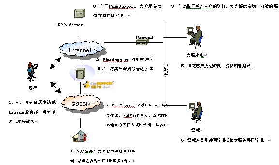 FineSupportTM網(wǎng)通呼叫中心解決方案主要由以下幾個(gè)部分組成:Media Gateway(接受來自IP網(wǎng)的網(wǎng)絡(luò)電話、傳統(tǒng)電話等呼叫,傳送給軟交換系統(tǒng))、Service Switch(軟交換系統(tǒng),負(fù)責(zé)呼叫控制)、IP IVR(存儲(chǔ)顧客呼叫信息,播放語音提示信息)、Soft ACD(呼叫分配服務(wù)器,可定制多種分配策略)、Web Server(負(fù)責(zé)報(bào)表管理、站點(diǎn)管理和監(jiān)控、FAQ存儲(chǔ)管理、留言及文本交談管理等)、Chat Server(建立交談通道)、Remote Agent(坐席工作站。通過客戶端軟件進(jìn)行客服支持)。