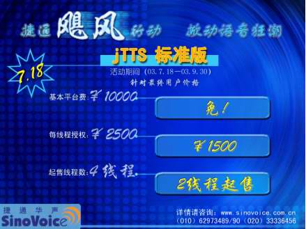 2003年7月18日,北京捷通華聲語(yǔ)音技術(shù)有限公司正式發(fā)布捷通華聲語(yǔ)音合成技術(shù) “jTTS標(biāo)準(zhǔn)版”。為慶!癹TTS標(biāo)準(zhǔn)版”的正式上市,為期近三個(gè)月,推廣“jTTS標(biāo)準(zhǔn)版”的捷通“颶風(fēng)行動(dòng)”也在同一時(shí)間正式啟動(dòng)! 捷通“颶風(fēng)行動(dòng)”的宗旨--用全新的產(chǎn)品、全方位的服務(wù)、最具競(jìng)爭(zhēng)力的價(jià)格與所有CTI領(lǐng)域的企業(yè)合作,開(kāi)啟面向中小型CTI系統(tǒng)語(yǔ)音應(yīng)用的市場(chǎng)大門(mén),為CTI產(chǎn)業(yè)發(fā)展提供持久動(dòng)力支持!