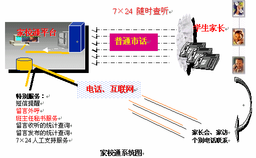 捷通華聲從關(guān)愛青少年成長出發(fā),提出了應(yīng)用于教育領(lǐng)域溝通平臺"家校通"系統(tǒng)的語音服務(wù)解決方案。家校通系統(tǒng)是一個融合了語音合成、計算機網(wǎng)絡(luò)集成綜合服務(wù)、互聯(lián)網(wǎng)、數(shù)據(jù)庫等多種先進IT技術(shù)為一體的新一代家校聯(lián)系工具。它充分利用互聯(lián)網(wǎng)與目前最為普及的公眾電話等資源,為學(xué)校提供多樣化的信息發(fā)布渠道,同時強大的7×24小時的留言發(fā)布和查聽服務(wù)功能,為老師和家長提供一種全新、高效、便捷的交流方式,大大提高了家長的滿意度,提升了學(xué)校的管理實力。