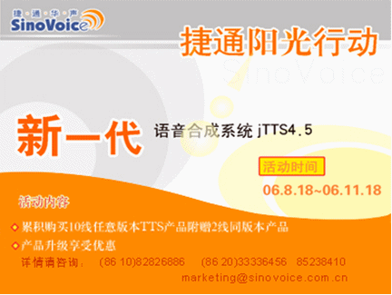 為慶祝jTTS4.5的上市,同時(shí)也為回饋廣大用戶,捷通華聲進(jìn)行為期三個(gè)月的推新品“陽光行動(dòng)”!詳情敬請(qǐng)瀏覽:http://www.sinovoice.com.cn/xwzx/20060818.htm