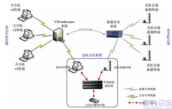 另外在廣東省消防信息系統(tǒng)內(nèi),現(xiàn)有硬件泰德電視電話會(huì)議系統(tǒng)共有23個(gè)終端節(jié)點(diǎn),主要基于獨(dú)立的IP專用網(wǎng)絡(luò),并與V2conference系統(tǒng)所在IP網(wǎng)絡(luò)相互獨(dú)立。為了達(dá)到和硬件系統(tǒng)共用互通,實(shí)現(xiàn)全網(wǎng)會(huì)議互通,在總隊(duì)會(huì)議系統(tǒng)中,將會(huì)議系統(tǒng)一級(jí)網(wǎng)(省公安廳——消防總隊(duì))、二級(jí)網(wǎng)(消防總隊(duì)——支隊(duì))、三級(jí)網(wǎng)(消防支隊(duì)——消防大中隊(duì))通過(guò)消防總隊(duì)會(huì)議控制系統(tǒng)和v2conference系統(tǒng)自帶的H.323互通功能模塊融合到一起。
