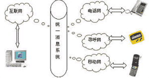 UMS可以將電子郵件、語(yǔ)音、尋呼、移動(dòng)短消息、傳真和多媒體數(shù)據(jù)等所有信息類(lèi)型集合為一個(gè)信息,并可用電話(huà)、傳真、手機(jī)、呼機(jī)、PC、掌上電腦、PDA等通信設(shè)備中的任何一種接收,在有線(xiàn)、無(wú)線(xiàn)、互聯(lián)網(wǎng)之間架構(gòu)起一個(gè)信息互聯(lián)通道(如圖)。統(tǒng)一信息系統(tǒng)(Unified