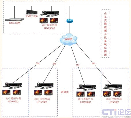 山東省交通廳高清視頻會議系統(tǒng)架構(gòu)在一個完善的、高性能的TCP/IP網(wǎng)絡基礎之上,基于交通廳全新開通的2M專線光纖網(wǎng)絡,以省交通廳為主會場,全省各地市交通局(委)為分會場,共18個會場。