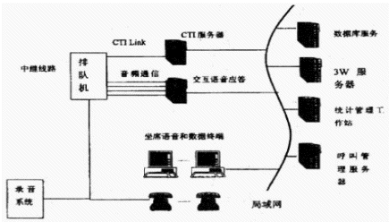 中型呼叫中心:人工座席在50~100之間的呼叫中心稱為中型呼叫中心。中型呼叫中心PBX與CTI服務(wù)器、人工座席直接相連,人工座席又與應(yīng)用服務(wù)器相連,客戶資料存儲在應(yīng)用服務(wù)器中,應(yīng)用服務(wù)器實(shí)時(shí)地將打入電話的客戶的資料自動(dòng)地在計(jì)算機(jī)屏幕上彈出,使座席人員能及時(shí)獲得相應(yīng)信息。CTI服務(wù)器一般由CTI硬件開發(fā)商的板卡和PC組成。