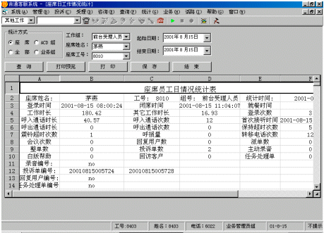 指定坐席的工作狀態(tài)(坐席工號(hào)、分機(jī)號(hào)碼、業(yè)務(wù)類(lèi)型、忙閑狀態(tài)、通話(huà)時(shí)長(zhǎng)等)