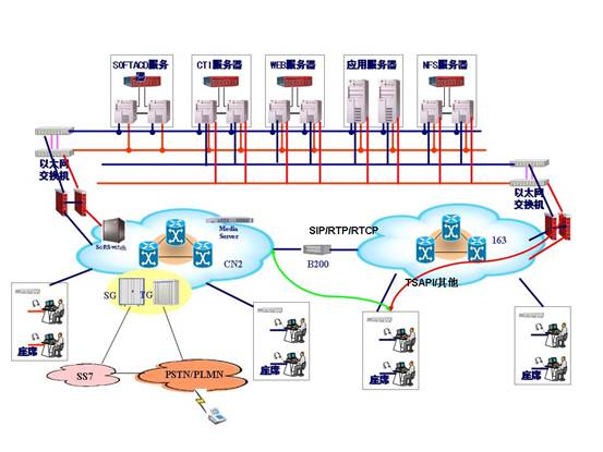 客戶(hù)座席可以分布在不同的地點(diǎn),集中在電信機(jī)房的座席可以直接部署到CN2網(wǎng)上,分布在客戶(hù)處的座席,可以部署在各地市專(zhuān)網(wǎng)上或者163城域網(wǎng)上。部署在163網(wǎng)和專(zhuān)網(wǎng)上的座席,語(yǔ)音流和SIP協(xié)議通過(guò)寬帶接入網(wǎng)關(guān)