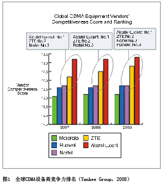 All-IP上的領先地位的進一步鞏固,中興通訊已經成為全球CDMA的領導者, Yankee group 2008年的一份咨詢報告顯示,中興通訊CDMA綜合排名穩(wěn)居全球第一集團行列(見圖1)。