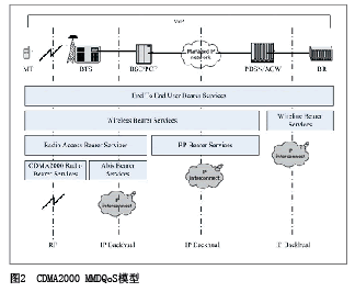 IMS是端到端的全IP架構,提供端到端的VoIP業(yè)務取代傳統(tǒng)的移動電話業(yè)務。對于VoIP電話,影響其發(fā)展的首要因素是需要提供完善的QoS機制來保證其話音質量不差于傳統(tǒng)移動電話的話音質量。圖2顯示了CDMA2000