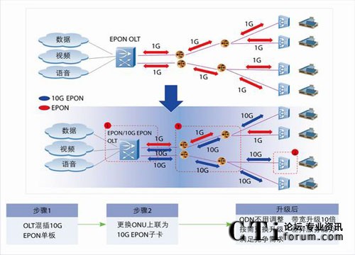 項目選取的試點小區(qū)建設(shè)于2006年,原來規(guī)劃的是每用戶6M帶寬。后期小區(qū)實裝率高,實際用戶超過1500戶,IPTV業(yè)務(wù)申請量提升后,出現(xiàn)了高峰時段IPTV點播業(yè)務(wù)不流暢、同時應(yīng)用IPTV和上網(wǎng)業(yè)務(wù)時網(wǎng)速過慢等問題。而且當(dāng)湖北電信新推出10M~20M的新寬帶套餐時,該小區(qū)用戶申請新套餐數(shù)量受限。該小區(qū)的寬帶接入網(wǎng)絡(luò)已經(jīng)明顯無法滿足用戶日益增長的需求,寬帶提速正當(dāng)其時。選擇10G EPON,能夠簡單兩步,將小區(qū)接入方式從EPON平滑升級為10G EPON,無需改變網(wǎng)絡(luò)結(jié)構(gòu),只需簡單升級設(shè)備(見圖)。