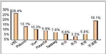 在無提示情況下,被調(diào)查者首先想到的視頻會(huì)議終端系統(tǒng)的品牌分布情況,即品牌第一提及率指標(biāo),可以反映出各品牌被用戶認(rèn)知的廣泛程度。賽迪顧問調(diào)查數(shù)據(jù)顯示,第一提及率最高的品牌是VTEL,支持率達(dá)到26.4%,比處于第二位的品牌高出13.3個(gè)百分點(diǎn);其次是Polycom和Vcon,支持率達(dá)到13.1%和10.3%。(見圖1)