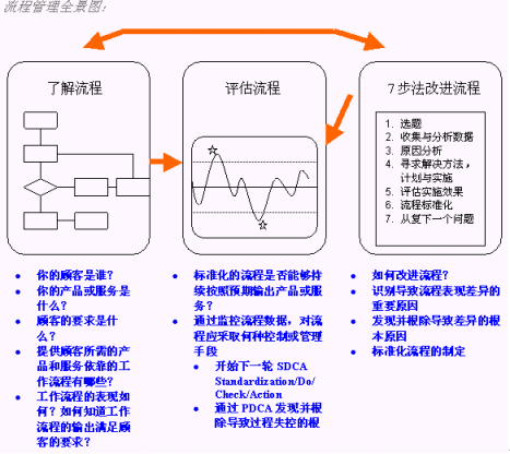 "TQM"核心思想究竟是什么呢?簡(jiǎn)言之,"TQM"分為三步:了解流程,檢討流程,改進(jìn)流程。下圖可以很好說(shuō)明這種思想: