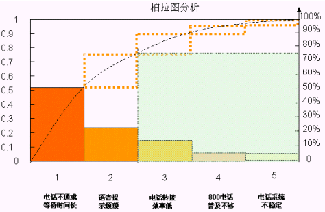 通過(guò)匯總的數(shù)據(jù)進(jìn)行分析,他們發(fā)現(xiàn)客戶(hù)不滿(mǎn)意的原因很多,于是選取了最大的五個(gè)原因, 用"柏拉圖"做了分析,同時(shí),對(duì)于這最重要的五個(gè)原因又作了一次頭腦風(fēng)暴和"魚(yú)骨圖分析"。