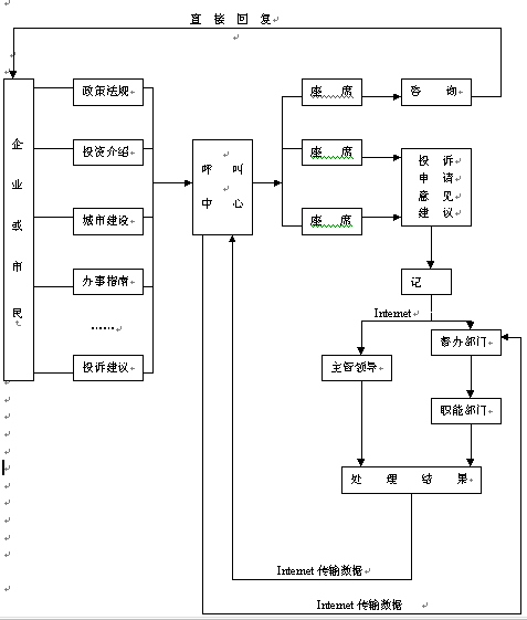 1、成為政府電話信息中心。將收集到的各種信息和問題,按政府要求分類傳送到有關(guān)部門,并跟蹤處理情況、結(jié)果,促進(jìn)政府提高工作效率。
