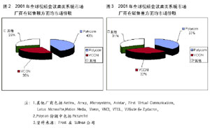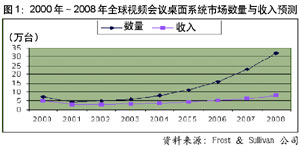 2002年年初,在IDC預(yù)測的本年度IT業(yè)界熱點技術(shù)中,視頻會議技術(shù)位居前列。而根據(jù)通信專業(yè)領(lǐng)域著名獨(dú)立研究機(jī)構(gòu)Wainhouse 的一份調(diào)查報告,2001年全球視頻通信領(lǐng)域僅設(shè)備市場,容量就達(dá)到近6億美元,占整個視頻會議市場52%的份額。Wainhouse還指出,2002年是視頻會議領(lǐng)域發(fā)展極為迅猛的一年,估計到2006年,整個視頻會議市場的市場容量將達(dá)到29億美元,比2001年增長20.4%。