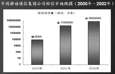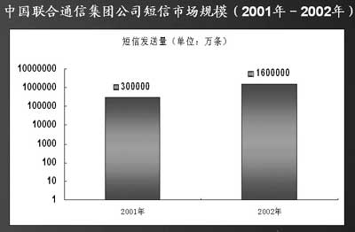 “從2001年的189億條增長(zhǎng)到2002年的超過900億條,我國(guó)短信業(yè)務(wù)的增長(zhǎng)率是移動(dòng)用戶數(shù)增長(zhǎng)率的3.4倍! 計(jì)世資訊分析師許牧說。