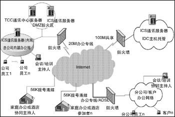 在實際建立的系統(tǒng)中,采用了公司內(nèi)部3臺服務器。一臺ICC主要用作登錄認證及用戶和服務器管理;2臺ICS服務器,一臺布置在防火區(qū),供外網(wǎng)用戶的訪問,一臺在內(nèi)網(wǎng),供公司內(nèi)部員工使用。在公司外面,托管了一臺ICS(通訊服務器),供公司外部用戶訪問。