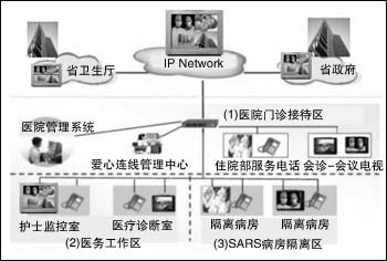 在安裝過(guò)程中,醫(yī)院通過(guò)原有的網(wǎng)絡(luò)系統(tǒng)就可完成視頻系統(tǒng)的搭建,該系統(tǒng)可應(yīng)用于隔離區(qū)、護(hù)士監(jiān)控室、會(huì)議室、醫(yī)療診斷室、住院部等地方。每個(gè)房間只要安裝一臺(tái)DVC-1000,同時(shí)配備電視機(jī)或投影機(jī)等視音頻播放設(shè)備,通過(guò)上面所述的安裝程序,就可以搭建一套互動(dòng)式的視頻系統(tǒng),這樣醫(yī)護(hù)人員只要在監(jiān)控室就可以隨時(shí)觀察隔離區(qū)的病人(如圖2所示)。