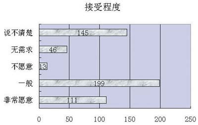 在調查中,67.4%的用戶對現(xiàn)有中國電信的資費標準(10元/分鐘)表示不滿,32.6%的用戶表示滿意。但同時58%的用戶對能接受的資費標準上又選擇了居中和較高的資費標準,表明用戶對視訊應用產(chǎn)品的價格承受能力較高。