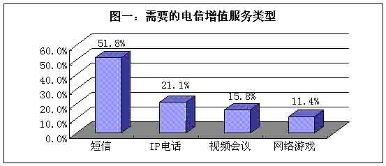 當(dāng)用戶被問到“最需要的電信增值服務(wù)是什么?”,在短信、IP電話、視頻會(huì)議和網(wǎng)絡(luò)游戲這四個(gè)備選項(xiàng)當(dāng)中,超過一半的被訪者選擇短信;其次是IP電話,選擇此項(xiàng)的被訪者占據(jù)21%;再是視頻會(huì)議,選擇此類多媒體通訊方式的被訪者約占16%;最后是網(wǎng)絡(luò)游戲,需要此類增值服務(wù)的人約為10%。(見圖一)