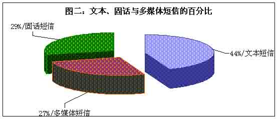目前市場(chǎng)的主流短信主要有三大類,即傳統(tǒng)的手機(jī)文本短信、流行的圖音文字兼?zhèn)涞摹安市拧焙托峦瞥龅墓淘挾绦拧U麄(gè)短信市場(chǎng)確實(shí)火了,但是在火爆的背后哪一種短信是真正的巨無霸?調(diào)查表明,在三類短信之中,選擇文本類短信的用戶最多,占據(jù)44%,其次是固話短信,再次是多媒體短信,即俗稱的“彩信”,選擇固話短信和彩信的百分比十分接近。(見圖二)看來,“巨無霸”非文本類短信莫屬。