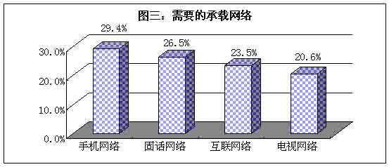 首先,手機(jī)構(gòu)成移動(dòng)的網(wǎng)絡(luò)已經(jīng)超過傳統(tǒng)的龐大的固話網(wǎng)絡(luò),成為用戶目前用戶最需要的承載網(wǎng)絡(luò)。這顯然是用戶市場(chǎng)對(duì)移動(dòng)通訊方式的需求日漸強(qiáng)烈的表現(xiàn)。其次,電視網(wǎng)絡(luò)拉后于固話和互聯(lián)網(wǎng)絡(luò),排在最后一位,這反映了未來網(wǎng)絡(luò)向雙向溝通發(fā)展的態(tài)勢(shì)。最后,互聯(lián)網(wǎng)絡(luò)雖然早于移動(dòng)網(wǎng)絡(luò)的發(fā)展,而用戶卻更為看重后者,原因是作為互聯(lián)網(wǎng)絡(luò)終端設(shè)備的電腦,還不能走入普通百姓家庭,因此終端設(shè)備成為互聯(lián)網(wǎng)絡(luò)發(fā)展的門檻。