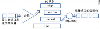 為了實(shí)現(xiàn)QoS,需要改變傳統(tǒng)IP網(wǎng)絡(luò)的FIFO隊(duì)列傳輸報(bào)文機(jī)制,轉(zhuǎn)而采用優(yōu)先級(jí)隊(duì)列(Priority Queueing, PQ)機(jī)制,見(jiàn)圖2。