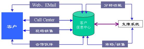 CRM系統(tǒng)的實(shí)施與企業(yè)的內(nèi)部和外部系統(tǒng)緊密相關(guān)。其涉及市場(chǎng)、營(yíng)銷、銷售、實(shí)施、客戶服務(wù)與支持等一系列循環(huán)過程。一個(gè)完整的CRM系統(tǒng)不僅包含與客戶的多方位的多渠道接觸外,還包含市場(chǎng)的定位和分割,營(yíng)銷策略的制定和客戶細(xì)分,銷售機(jī)會(huì)的把握,銷售的執(zhí)行(任務(wù)分派,任務(wù)的跟蹤),客戶的管理與分析,客戶的反饋與策略的評(píng)判等。從而再重新修正市場(chǎng)策略。這樣一個(gè)循環(huán)過程涉及管理、市場(chǎng)、客戶、產(chǎn)品、數(shù)據(jù)分析與處理等多學(xué)科的知識(shí)與技術(shù)。