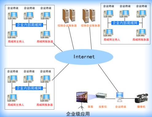 在企業(yè)級別的應用中,企業(yè)將服務器構架在公司內(nèi)部,遠程用戶及局域網(wǎng)內(nèi)部的用戶均可登錄服務器,實現(xiàn)交互。企業(yè)級視頻會議系統(tǒng)的應用實際上就是將桌面級視頻會議與會議室級視頻會議系統(tǒng)有機的結合在一起,客戶端硬件外設可以按照以上的建議,根據(jù)各終端不同的需求進行配置。