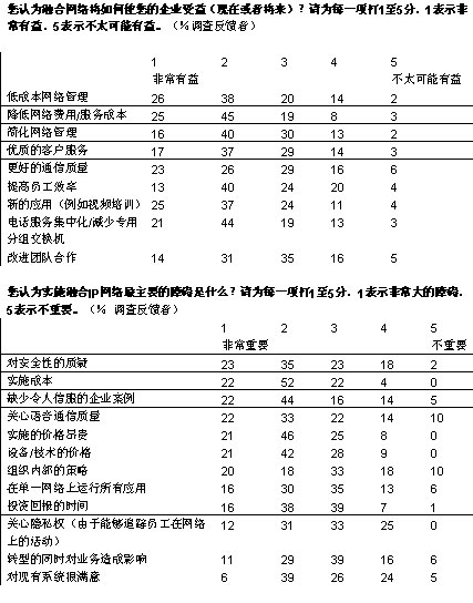 不久以前,“融合”這個詞給人的感覺是過分追捧技術和超前于時代的概念。此后不久,傳輸數(shù)據、語音和視頻的網絡融合逐漸成為現(xiàn)實。根據對103位高級經理的調查結果表明,三分之二的企業(yè)正計劃在今后五年內將其覆蓋整個企業(yè)的應用轉型為統(tǒng)一的IP網絡。四分之一的調查反饋者認為這對實現(xiàn)其企業(yè)戰(zhàn)略“尤為重要”。