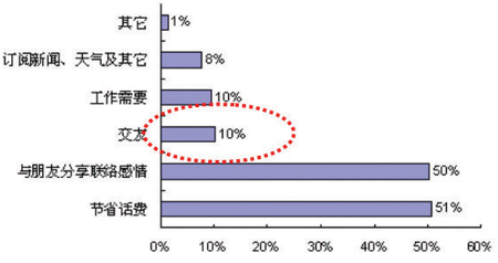 首先從使用目的看,我們的調(diào)查研究表明,大部分用戶使用短信最主要的目的是節(jié)省話費,該類用戶比例高達51%; 其次是與朋友分享,以及聯(lián)絡(luò)感情,比例為50%; 而其他如交友、工作需要、訂閱新聞、天氣及其他等所占比例較低,均不超過10%。由此可見,雖然短信業(yè)務(wù)已經(jīng)深入地滲透了用戶的生活,但是用戶的主要應(yīng)用仍然是點對點的應(yīng)用,信息類的應(yīng)用只占很小的部分(見圖2)。